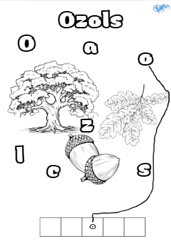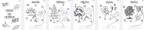 Darba lapas par tēmu “Koki un krūmi”. Darbs sastāv no 19 lapām, uz katras lapas bērns var izkrāsot kādu koku vai krūmi, burtus un pēc tam ar līnijām veidot vārdu. Katrā lapā ir par diviem burtiem vairāk nekā vārda burtu.