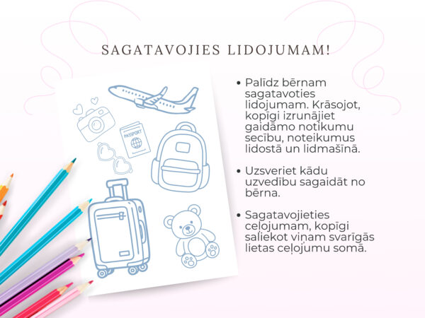 Sagatavojies pirmajam lidojumam! Šajā materiāla iekļauts sertifikāts, kuru pasniegt bērnam pēc pirmā lidojuma un 5 gaiši zilas krāsojamās lapas, kuras krāsojot kopā ar vecākiem, pirms lidojuma, palīdzēs bērnam sagatavoties gaidāmajam ceļojumam. Kopīgi izrunājot par noteikumiem lidostā, lidmašīnā un notikumu secību, bērns jutīsies drošs un pārliecināts. Krāsojamās lapās dažādi elementi kā ceļojumu soma, pase, līdzi ņemamās rotaļlietas, uzkodas, norādes par piesprādzēšanos lidmašīnā, par iespējamiem trokšņiem un taml.