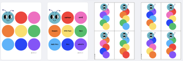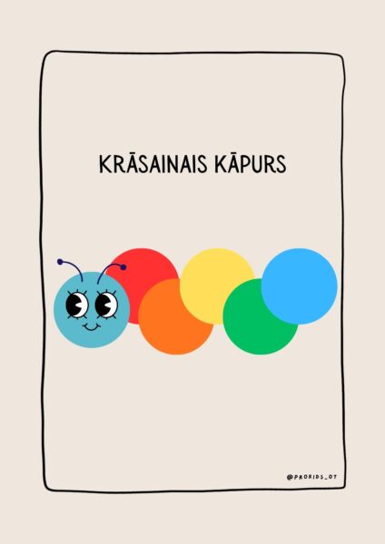 Komplektā: 8 krāsu lapas izgriešanai un 20 kartītes ar kāpuriem no 5 dažādu krāsu riņķiem.