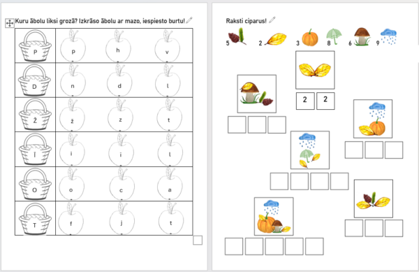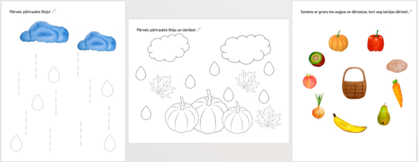 Rudens uzdevumi 2. vecumposma bērniem. Materiālā iekļauti uzdevumi roku muskulatūras attīstībai – griešana pa līniju, līniju pārvilkšana, līmēšana un krāsošana.