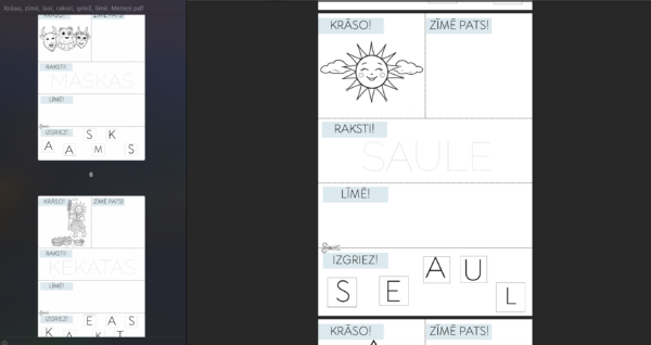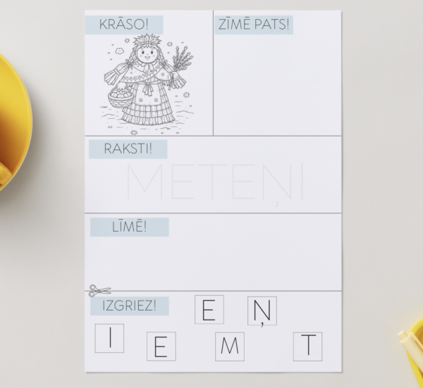 Daudzpusīgs un radošs darba lapu komplekts, kas iepazīstina bērnus ar latviešu gadskārtu ieražu svētkiem — Meteņiem, vienlaikus attīstot dažādas prasmes. Materiālā iekļautas 10 darba lapas, kur katrā lapā bērni veic vairākas darbības: krāso attēlu, zīmē pats, pārraksta vārdu ar punktotām līnijām, līmē un izgriež burtus, veidojot vārdu.
