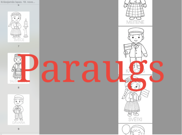 Materiālā iekļautas vienkāršas, skaidras ilustrācijas ar latviešu tautastērpiem, karogiem, svecēm, baloniem un svētku simboliem, kas palīdz bērniem attīstīt radošumu un iepazīt Latvijas kultūras tradīcijas.