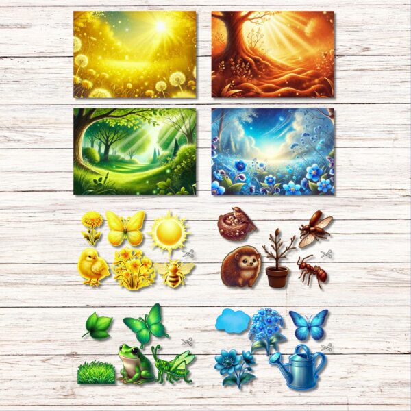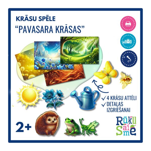 “Pavasara krāsu spēle” ir jautra un attīstoša spēle, kas iepazīstina bērnus ar pavasara dabas krāsām. Spēle sastāv no 4 dažādu krāsu attēliem, kas saistīti ar pavasari (piemēram, zaļa zāle, dzelteni tauriņi, sarkanas tulpes un zilas debesis), un izgriežamām detaļām, kuras bērns var pielāgot atbilstošajai krāsai.
