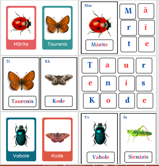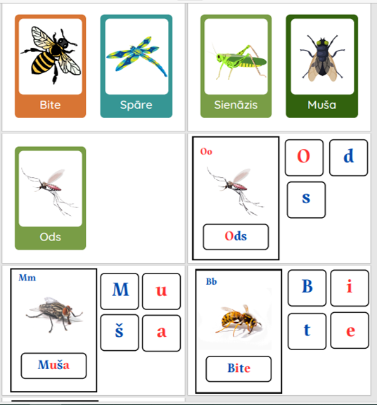 Dotas kukaiņu kartītes ar nosaukumu,  blakus attēlam ir burti kuri  bērnam jāsakārto, lai izveidotu vārdu. Prasme atpazīt dotos kukaiņus, salikt vārdus, izlasīt tos,  atpazīt patskaņus un līdzskaņus vārdos. Patskaņi un līdzskaņi ir atšķirīgās krāsās.