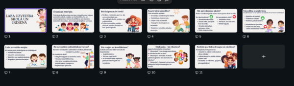 ✔ Interaktīvu prezentāciju ar vizuāliem materiāliem, kas skolēniem saprotamā veidā skaidro labas uzvedības nozīmi dažādās situācijās. Prezentācija ietver arī diskusijas jautājumus un piemērus, kas mudina skolēnus padomāt par savu rīcību.