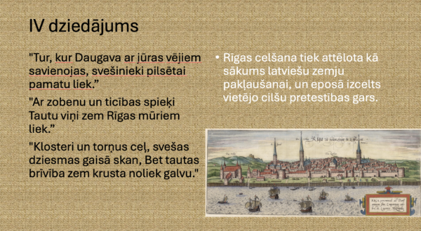 Prezentācijā iekļauta konspektīva informācija, kas papildināta ar atbilstošiem attēliem, par vēstures notikumiem, citāti no eposa teksta, jautājumi skolēniem, kā arī uzdevums stundas noslēgumā.