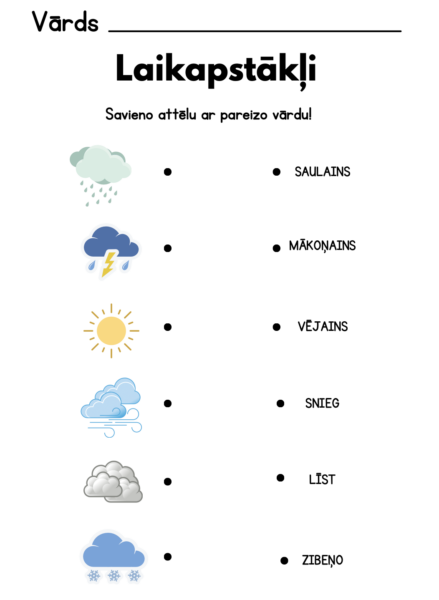 Jāsavieno attēls ar vārdu, kurš raksturo laikapstākļus. Vārdi norādīti ar lielajiem drukātajiem burtiem.