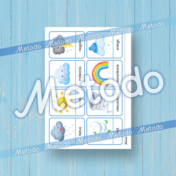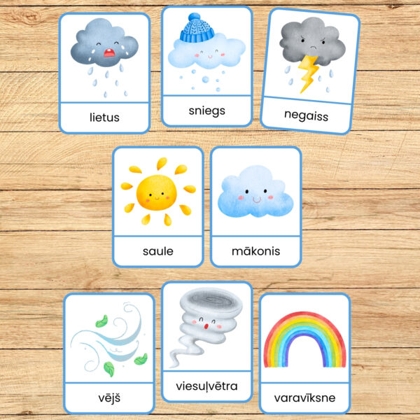 8 kartītes ar dažādiem laikapstākļiem un to nosaukumiem.