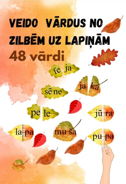 Materiālā iekļautas 48 rudens lapiņas,no kurām var izveidot divzilbju vārdus.Lielie iespiestie un mazoe iespiestie.