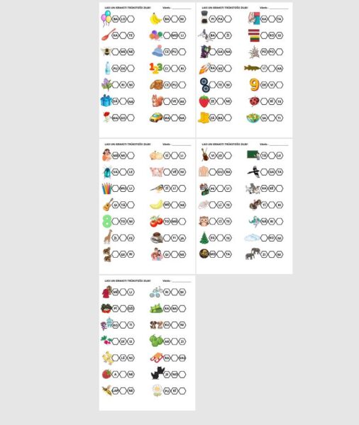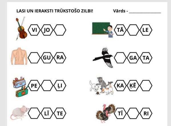 5 darba lapas ar 1 trūkstošu zilbi katrā vārdā (gan sākumā, gan vidū, gan beigās).
