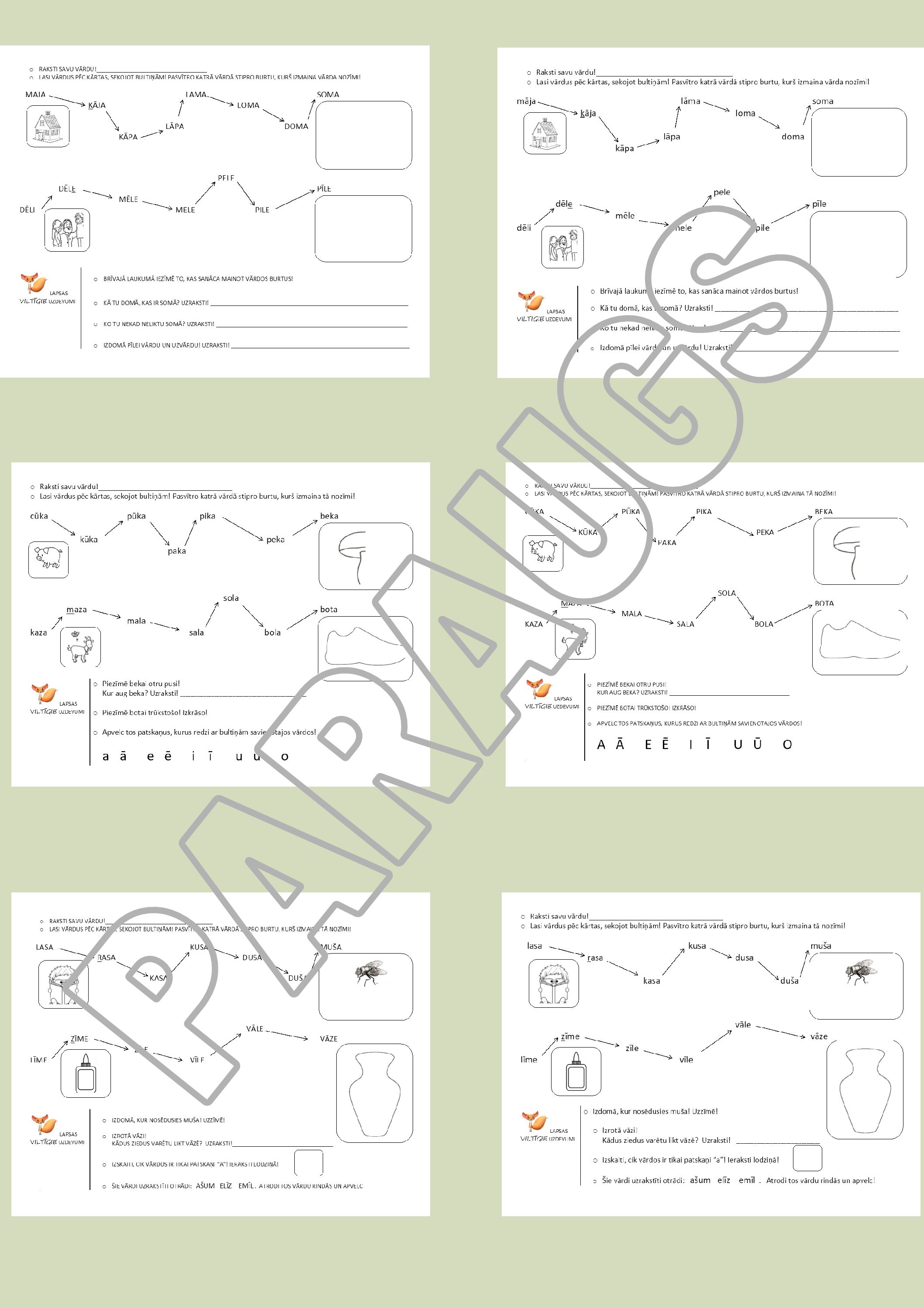 Katrā lapā divas vārdu rindas. Katra veida lapas ir gan ar lielajiem, gan ar mazajiem drukātajiem burtiem, lai pedagogs varētu tās pielāgot bērnu lasītprasmei.