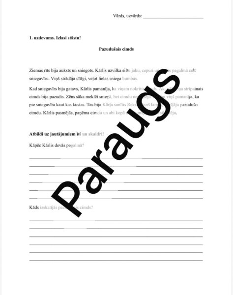 Darbs paredzēts 1. -2. klases skolēniem lasītprasmes un teksta izpratnes attīstīšanai. Darba lapā iekļauti dažādi uzdevumi, kas palīdz trenēt domāšanu, teikumu veidošanu un radošo izpausmi.
