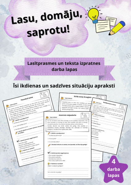 📖 Lasītprasmes un teksta izpratnes 4 darba lapas. Piemērotas 1. – 3. klases skolēniem.