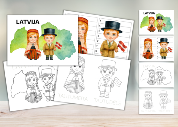Komplektā ietilpst 4 lapas ar ilustrācijām un uzdevumiem, kas palīdz bērniem iepazīt Latvijas tautas tērpu. Formāts: A4, fails: PDF.