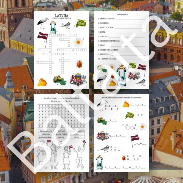 Šīs interesantās vārdu spēles ietver burtu jūkli, kurā būs jāatrod ar Latviju saistītu attēlu nosaukumi, krustvārdu mīkla, kurā būs jāatrod 10 dažādi vārdi, vārdu šifrēšanas darba lapa, kurā jāatšifrē dažādu attēlu nosaukumi, kuru burti ir sajaukti vietām, kā arī būs jāatšifrē un jāieraksta ar Latviju saistītu attēlu nosaukumi, aizpildot tukšās vietas to nosaukumos.