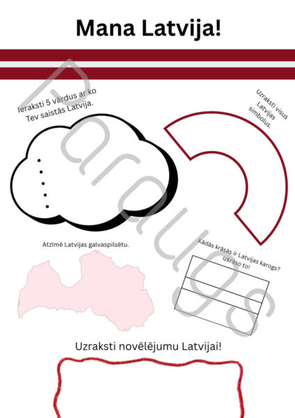 Latvijas dzimšanas dienas/18.novembra darba lapas (2). Darba lapās iekļautas krāsojamās lapas, dažādi uzdevumi – vārdu salikšana pareizā secībā, nelielā viktorīna, Latvijas dzimšanas dienas tortes zīmēšana, himnas pabeigšana, asociācijas ar Latviju, pirmā burta ievietošana un frāzes izveidošana, puzle. Materiālā ir 10 darba lapas, ko izmantot mācībās, lai veiksmīgi skolēnus izglītotu par Latviju, ap to.