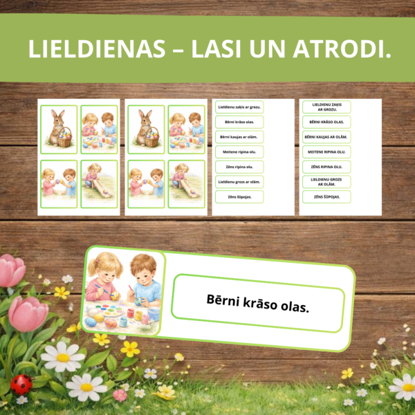 16 kartiņas ar ilustrācijām. Bērns izvēlas kartiņu ar attēlu un atrod atbilstošo teikumu.