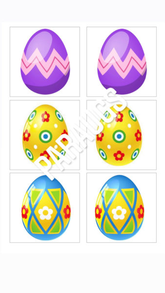 Kopā 6 lapas, 12 dažādas olas, kam jāatrod otra puse un 12 olas atmiņas spēlei.