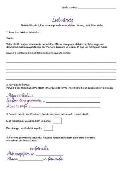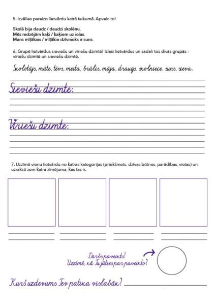 Meklē lietvārdus, grupē pa dzimtēm, pārveido vārdus no vienskaitļa uz daudzskaitli, papildini un zīmē.