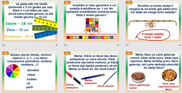 Prezentācijas iekļauti 33 iesildīšanās uzdevumi, 33 vidējas sarežģītības uzdevumi, 34 erudītu uzdevumi.