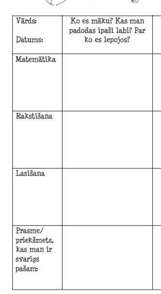 Skolēna daba lapa, lai izvērtētu savus sasniegumus matemātikā un latviešu valodā. Bērns pārdomā, kas līdz šim ir izdevies, kas sagādā grūtības. Izvirza mērķi, ko vēlas sasniegt, piemēram, iemācīties reizināšanas tabulu, kā arī plāno, kāda būs rīcība, lai šo mērķi sasniegtu.
