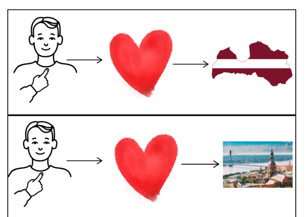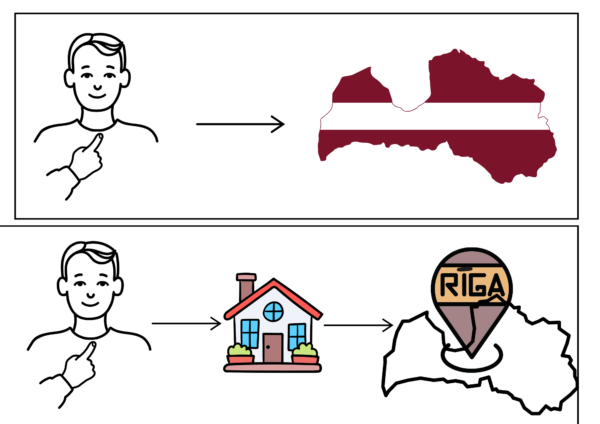 Ilustrētas shēmas vienkāršiem teikumiem (piemēram: Es dzīvoju Latvijā, Mana māja atrodas Rīga)