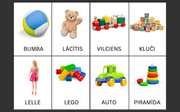 Materiāls aktīvā un pasīvā vārdu krājuma paplašināšanai. 52 attēli. Piemērots bērniem no 1 gada vecuma. Iekļautas tādas kategorijas kā: apģērbi, galda piederumi, rotaļlietas, transporta līdzekļi u.c.
