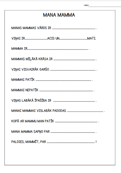 1. darba lapa- “Tā ir mana ģimene!”. Jāuzzīmē sava ģimene, jāuzraksta ģimenes locekļu vārdi un jāuzraksta ģimenes tradīcijas.