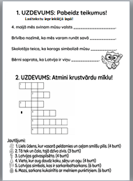 Materiālā iekļauti vienkārši, bērniem saprotami uzdevumi par Latviju, 4. maiju, Latvijas dabu, karogu un simboliem. Darba lapās ir teksts, teikumu pabeigšana, krustvārdu mīkla, vārdu uzdevumi un radošs karoga zīmēšanas uzdevums.