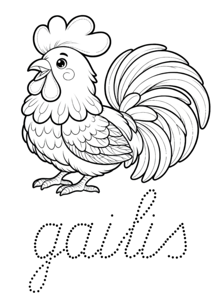 10 krāsojamās gaiļa lapas (5 ar drukāto burtu uzrakstu un 5 ar rakstīto burtu uzrakstu)