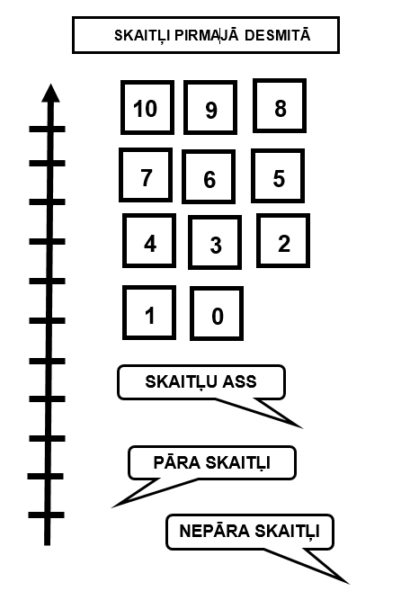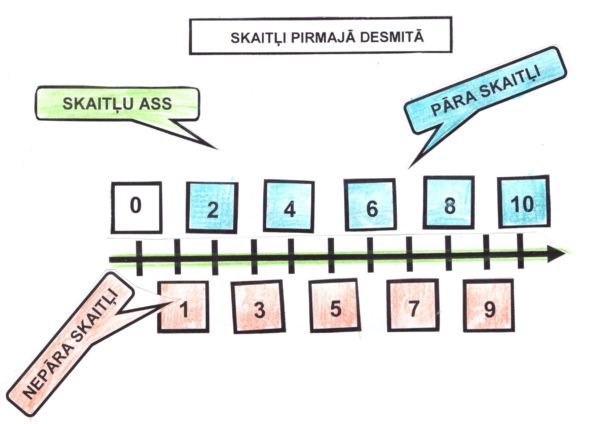– skaitļi pirmajā desmitā, skaitļu ass (atgādne sajauktā formā);