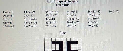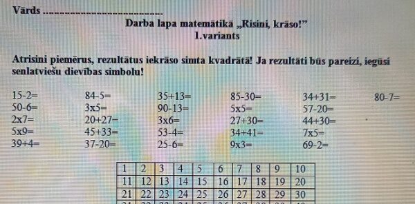 Uzdevuma izpildes laikā skolēns pilnveidos prasmes veikt reizināšanas darbības 50 apjomā (arī reizināšana ar 2), saskaitīšanas un atņemšanas darbības 100 apjomā. Veicot uzdevumu, bērns aprēķinās rezultātu, kuru iekrāsos simta kvadrātā. Ja visi piemēri tiks atrisināti pareizi, simta kvadrātā veidosies senlatviešu dievības simbols.