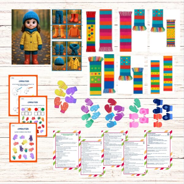Darbojoties ar pazīstamiem rudens apģērba priekšmetiem – cepurēm, šallēm, cimdiem un zābakiem, bērni skaita, salīdzina, kārto un radoši darbojas, apgūstot matemātiskās pamatprasmes caur rotaļu.
