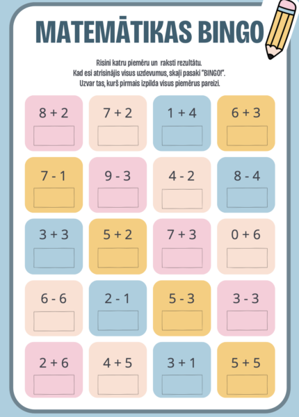 Darba lapa “Matemātikas bingo” paredzēta, lai spēliskā veidā atkārtotu saskaitīšanas un atņemšanas prasmes. Spēle apvieno mācību uzdevumus ar sacensību garu, motivējot skolēnus aktīvi piedalīties. Spēle. 10 apjomā, paredzēta 1.klasei vai pirmsskolai.