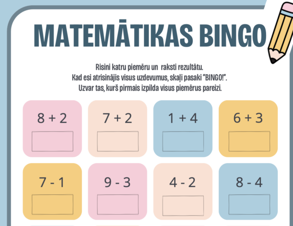 Darba lapa “Matemātikas bingo” paredzēta, lai spēliskā veidā atkārtotu saskaitīšanas un atņemšanas prasmes. Spēle apvieno mācību uzdevumus ar sacensību garu, motivējot skolēnus aktīvi piedalīties. Spēle 10 apjomā, paredzēta 1.klasei vai pirmsskolai.
