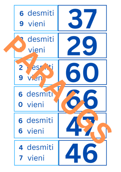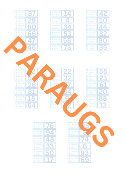 Šis domino komplekts ir lielisks palīgs sākumskolas skolēniem, lai nostiprinātu izpratni par skaitļu sadalīšanu desmitos un vienos. Komplektā ietilpst 8 lapas ar 48 domino kauliņiem, kuros skaitļi līdz 100 ir attēloti gan skaitliskā formā, gan sadalīti desmitos un vienos.
