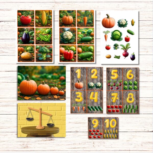 • Ciparu kartītes ar dārzeņiem (1–10) palīdz nostiprināt skaitļu secību un asociācijas ar priekšmetiem.