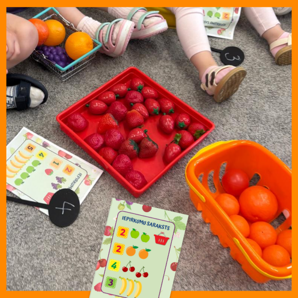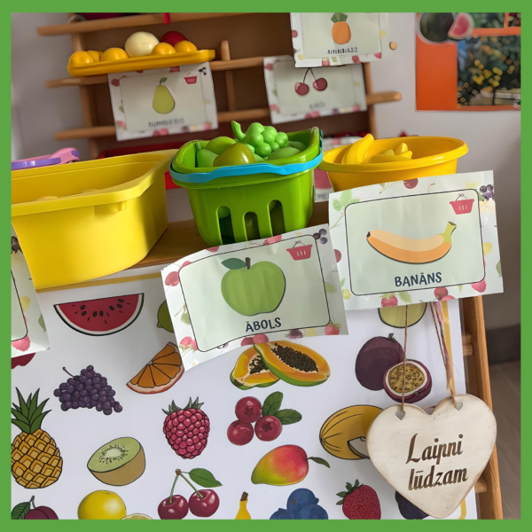 Šis izglītojošais materiāls bērniem no 3 gadu vecuma piedāvā aizraujošu iepirkšanās spēli, kurā bērni darbojas ar 12 iepirkumu sarakstiem, 3 tematiskām darba lapām un izgriežamiem augļu un ogu attēliem. Bērniem tiek dots uzdevums – saskaņā ar dotajiem sarakstiem atrast un pielīmēt atbilstošos augļus vai ogas, tādējādi stiprinot spēju sekot norādēm un strādāt secīgi.