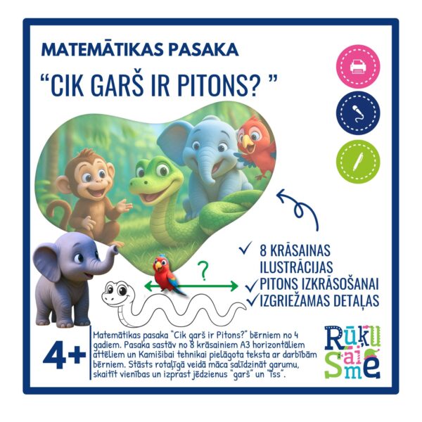 Izgriežami dzīvnieki – papagailis, pērtiķis, zilonēns, kurus bērni var novietot gar Pitonu, lai izmērītu tā garumu un praktiski pielietotu pasakā apgūtās zināšanas.