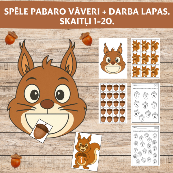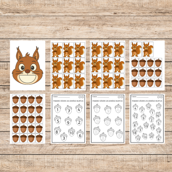 Materiāls – spēle “Pabaro vāveri” + darba lapas. Skaitļi 1–20.