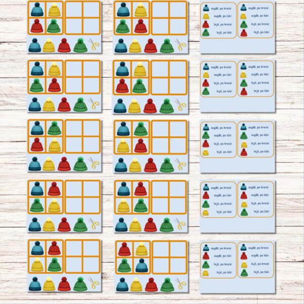Bērns izlasa norādes uz tekstuālās norāžu kartītes un, vadoties pēc instrukcijām, izvieto cepures “tukšajā kastītē.” Šis uzdevums uzlabo lasītprasmi, precizitāti un spēju sekot sarežģītākām instrukcijām.