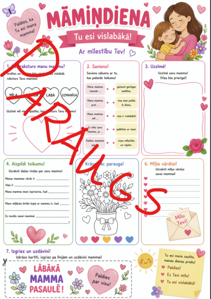 Darba lapa ir koša Māmiņdienas aktivitāte sākumskolai, kurā apvienoti dažādi uzdevumu veidi: vārdu izvēle un raksturošana, teikumu veidošana, rakstīšanas uzdevumi, zīmēšana un krāsošana, kā arī neliela dāvaniņa (kartītes) izveide. Tā attīsta bērnu valodu, domāšanu un radošumu, vienlaikus ļaujot izteikt mīlestību pret mammu.