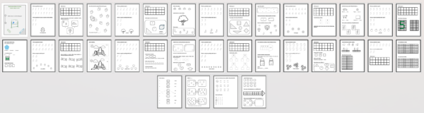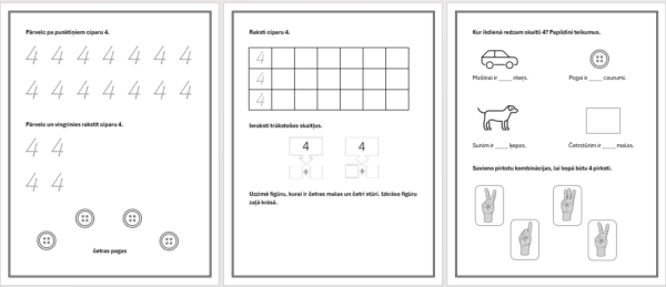 Kopumā uzdevumi 34 darba lapās. Materiāls melnbaltā krāsā, lai bērns pats var izkrāsot attēlus. Atsevišķas darba lapas var ielaminēt un aizpildīt ar flomasteru.