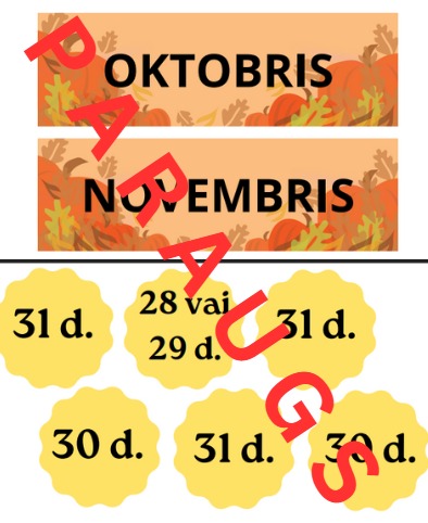 Mēnešu nosaukumi atgādnes/rotājuma/mācību līdzekļa veidā kopā ar dienu skaitu. Derētu pirmsskolas un sākumskolas vecuma bērniem. Ļoti labi piemērots matemātikas stundām 2.klasē, apgūstot tematu “2.4. Kā laika rēķini palīdz plānot?” Katrā lappusē ir divi mēneši.