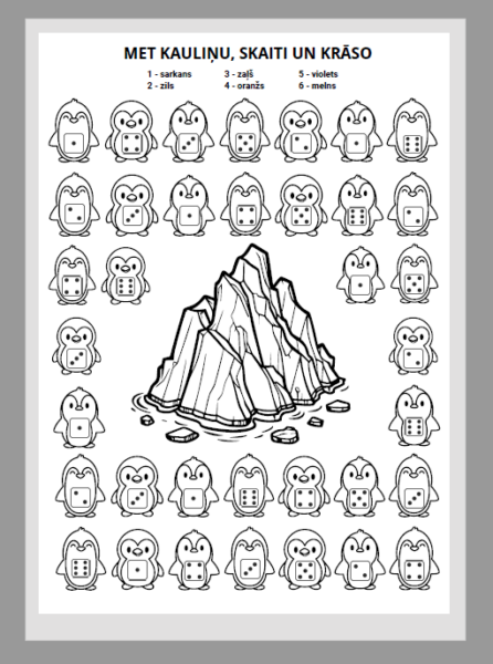 Katram kauliņa elementam ir sava noteikta krāsa.  Pēc dotā šifra jāizkrāso pingvīni atbilstošā krāsā.
