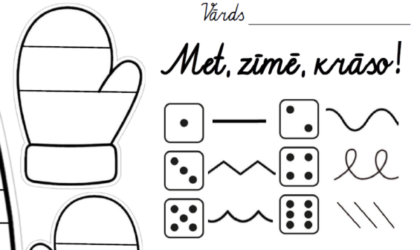 Spēle ar metamo kauliņu. Met, zīmē, krāso – izrotā ziemas apģērbu.