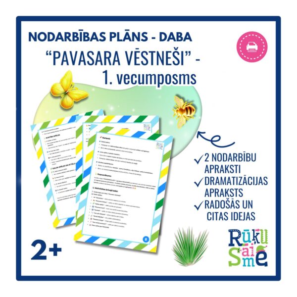 Nodarbības apraksts “Pavasara vēstneši” ir paredzēts bērniem līdz 4 gadu vecumam, lai caur praktisku izziņu un rotaļām iepazīstinātu ar pavasara pārmaiņām dabā. Bērni vēro, tausta, klausās, smaržo un kustās, izzinot saules siltuma, sniega kušanas, augu plaukšanas un dzīvnieku aktivitātes pavasarī. Nodarbībā tiek izmantotas sensorās tvertnes, galda un kustību spēles, radošās aktivitātes un dabas materiāli.