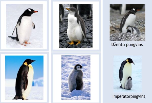Kartītes sastāv no vairākām daļām – nosaukums un attēls, kā arī pingvīna attīstības fāzes konkrētās sugas ietvarā. Lai noder!