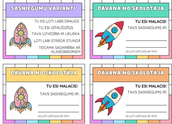 Motivācijas bonusu sistēma skolēniem. Skolēni var sakrāt mazās kartītes, kur skolotājs par katru pozitīvu uzslavu izdur caurumu. Tad, kad sakrāta kartīte ar caurumiem, ir iespējams saņemt galveno kartīti “Dāvana no skolotāja”. Kartītes var krāt visu semestri. Šī sistēma veicinās pozitīvu uzvedību klasē, kā arī skolēnu centību, mērķtiecību un iesaisti mācību procesā. Vienlaikus tā palīdzēs mazināt negatīvu uzvedību.