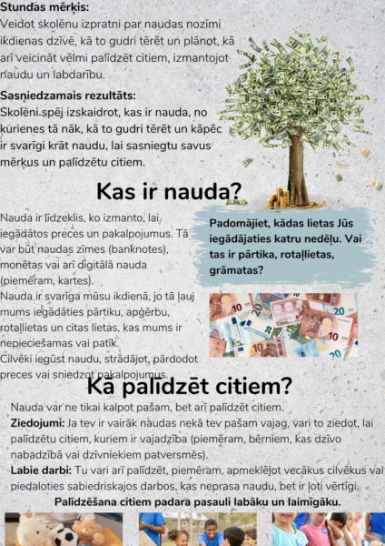 Šis materiāls ir lieliski piemērots mācību stundām, kurās skolēni apgūst būtiskas dzīves prasmes saistībā ar naudas lietošanu, finansiālo atbildību un palīdzēšanu citiem.